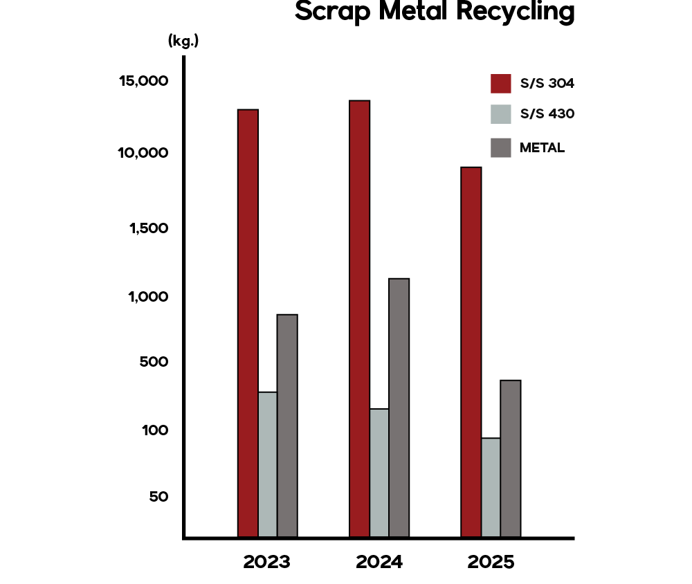 We actively recycle stainless steel, mild steel, and other metals used in our kitchen equipment manufacturing and installation projects. By sending these materials to certified recycling facilities in Thailand, we help reduce landfill waste, conserve valuable natural resources, and lower the environmental impact of producing new metals.